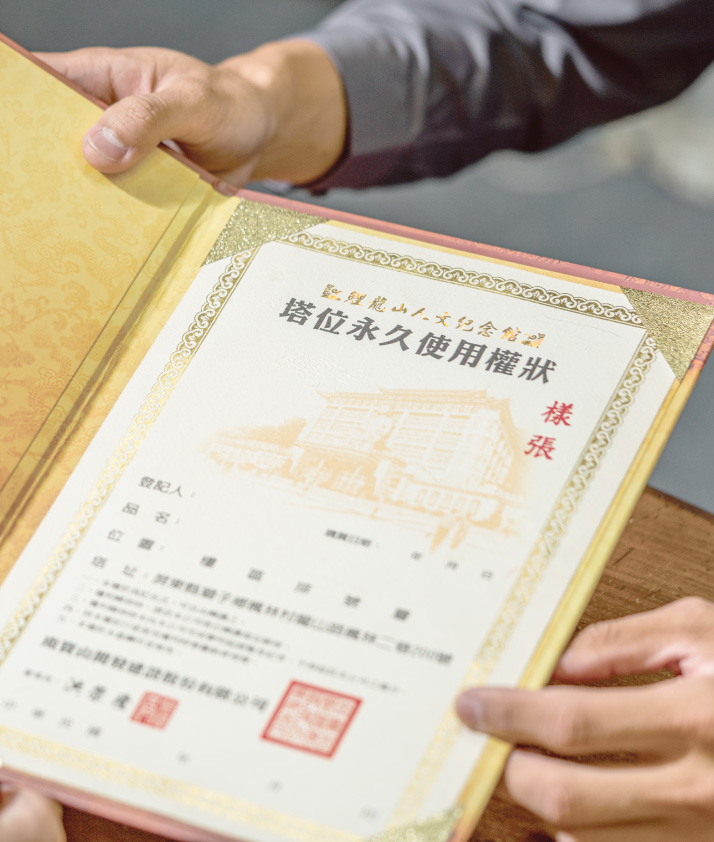 所有儀式完成後,本館將提供『孝思卡』,提醒百日、對年、生日忌日等重要紀念日,並提供祭拜流程諮詢,協助家屬後續追思與關懷服務。