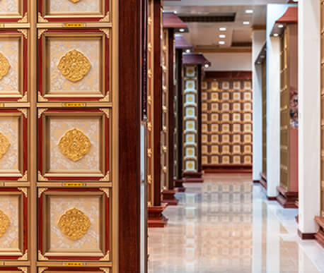 外觀:塔位採子母雙門,面版圖騰採高級琉璃雕塑。內部特別設計了蓮花及龍椅圖騰及往生咒經文,材質使用可耐用百年以上的鋁鎂鋅合金製作而成。可耐震、抗壓、防鏽、防腐蝕、防火、耐變形。